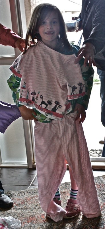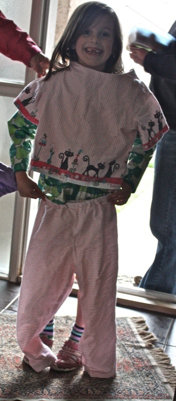 We visited, and played, and had ice cream. Then, everyone went home… but Ella had brought a surprise to show me. She is just finishing grade one, and has sewn her own pajamas! She has taken sewing lessons and brought them into the house to show me. I was in shock. I am teaching sewing at school and my grade 9 girls moan and complain profusely as they are making their aerobic pants. Little Ella has accomlished a top and a bottom of exceptional quality at six years old!