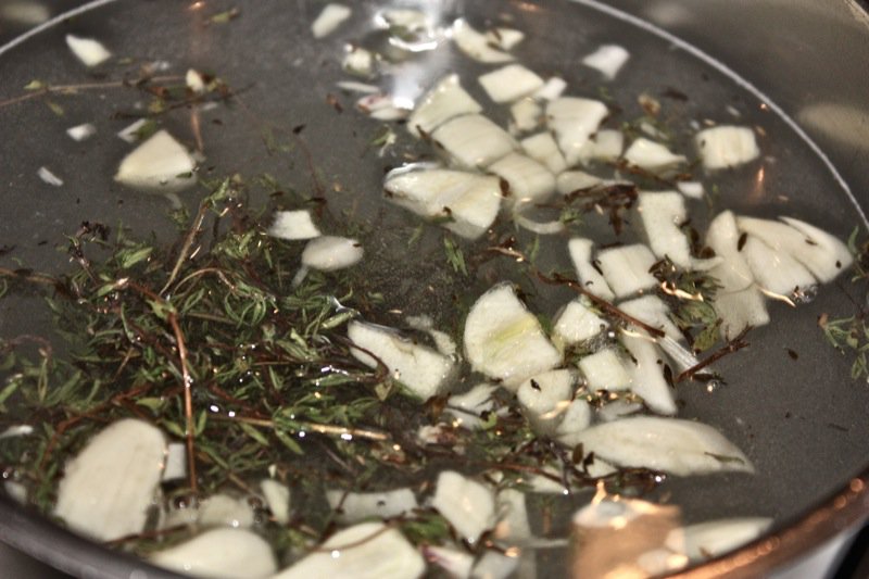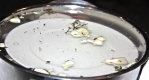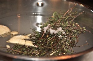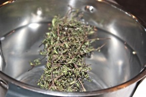 - The brine may be flavoured with sprigs of thyme, bay leaves, garlic, and orange/ lemon slices: I chose thyme and garlic