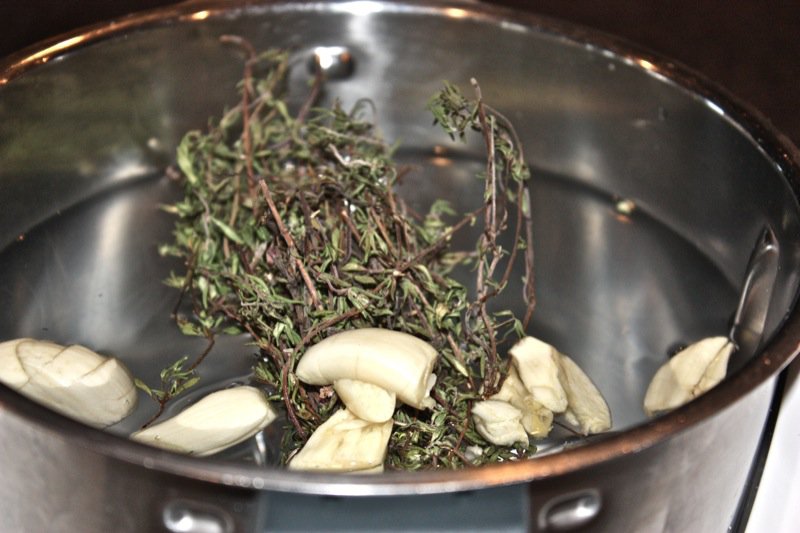 I buy my duck legs from Greens Eggs & Ham at the City Market (every Saturday throughout the summer). I chose to use my Thermomix to make the 5% salt water solution because is was easiest. It is certainly not necessary. I had 2 litres of water to 100 grams of kosher salt, several sprigs of time and some slivered garlic.