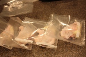 Once all four legs were vacuum packed, I placed them in the tray that came for the inside of the machine to ensure the food doesn’t float and is completely covered with water. I had filled the machine up to the “fill” mark with water and had it heating to the temperature of 176ºF. The video that came with the machine explained that the water level would increase as the food was put in, but that the food had to be completely covered (and the level could not exceed the “full” mark on the inside of the machine). It looked like it needed more water to cover these legs, so instead of having to add cold water to cover the legs, I chose to fill the machine with more water, but not to the “full” mark. I could remove some water, if necessary, and that seemed better than adding cold water to the mix. It took about 30 minutes to reach temperature and was ready once we had all of the meat washed, dried, seasoned and bagged.