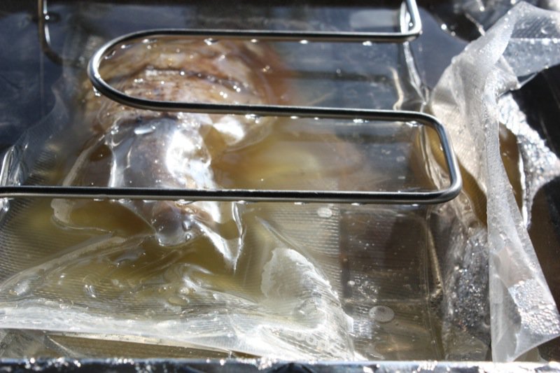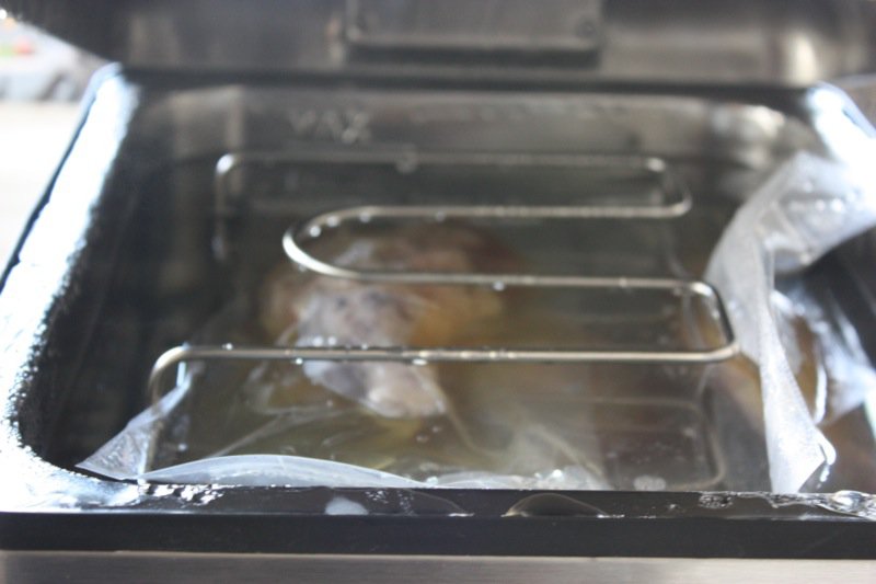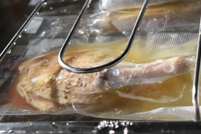 - Place the vacuum sealed legs in a 176°F (80°C) water bath for 8 to 12 hours: as I was going to the Market Saturday morning, they were out in 10 hours
