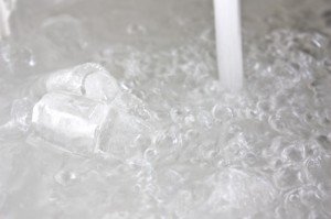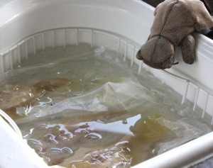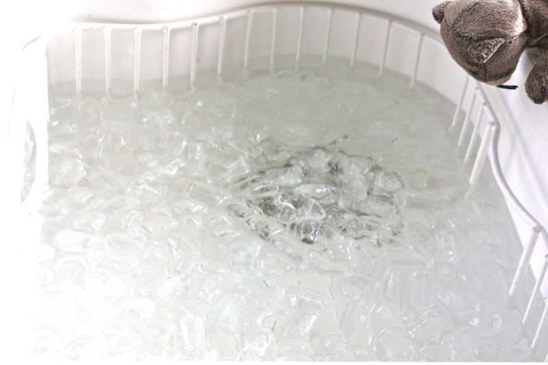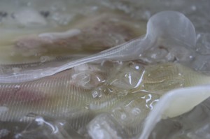 I was amazed at how wonderful the meat smelled. Into the ice bath until the fat solidified around the meat. The ice bath must be at least half ice. I used a big ice bag and then added water. It is important to follow the cooling time table (below the recipe) to avoid pathogens. The photos are deceiving as there was definitely half ice or more in my ice bath.