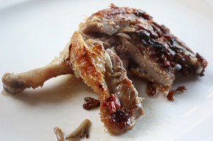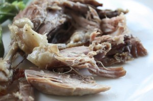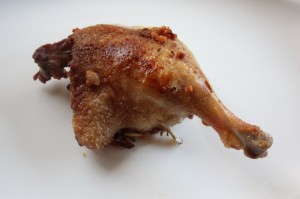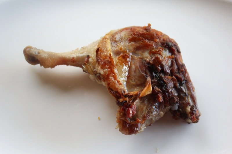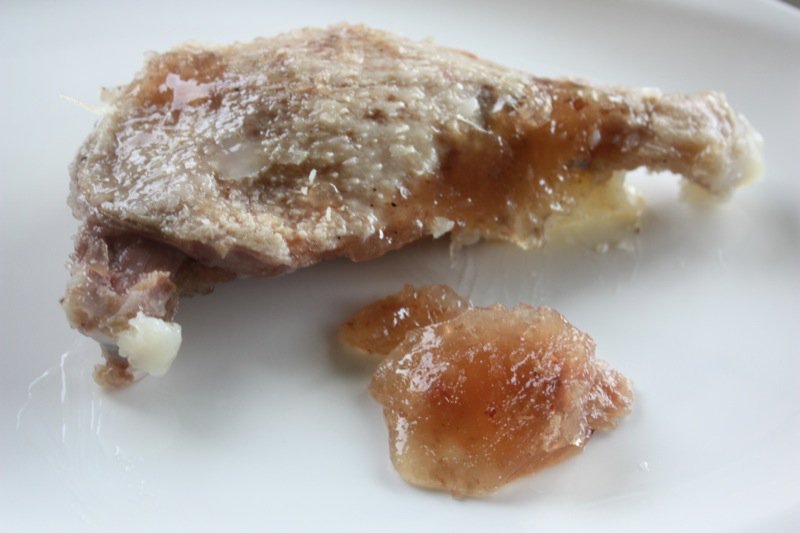 I was really suprised by the difference in texture and tenderness of the two legs. The sous vide leg was so succulent and tender and the other leg appeared tough. I was pleased with the brining of the sous vide leg as the flavour of the thyme and garlic scented the meat, yet there was not too much salt which has been a problem for me when I make duck confit using the tradtional method. The other leg had not been brined or seasoned, other than salt and pepper. It did have a really great flavour, but it was like comparing apples to oranges. The sous vide duck was definitely more tasty, so much more tender, and just leaps and bounds ahead of the other duck leg in flavour, taste, mouth feel, appearance, and even smell. Vanja thinks I am going a little far with the smell idea. He didn’t share that opinion with me.