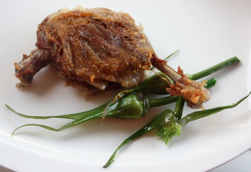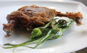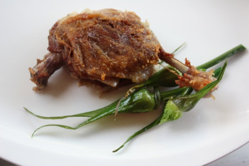 And what better way to test the sous vide method than to compare it with traditional cooking. I probably should have compared it to my traditionally prepared duck confit. Instead, I compared it to a leg of duck fried in the pan beside it, but for considerably longer (below, right). It also looks lovely. I guess I should confess what is fairly obvious here. I didn’t clean the leg to release the meat from the end before I began my fun. I have done that in one of my confit posts to come, and it is much prettier. I used elephant garlic chives purchased from Mona‘s at the City Market. (I had never tried them before, but they were delicious. Novel, pretty, and tasty: that’s a great combination.)