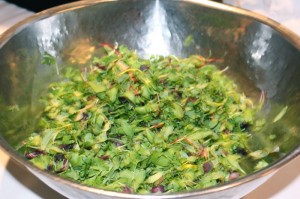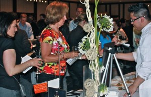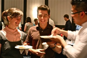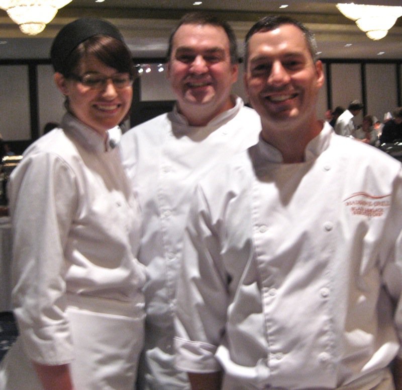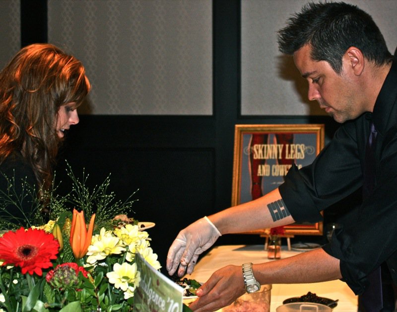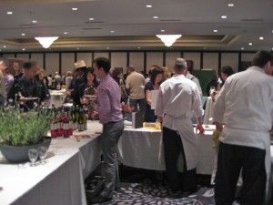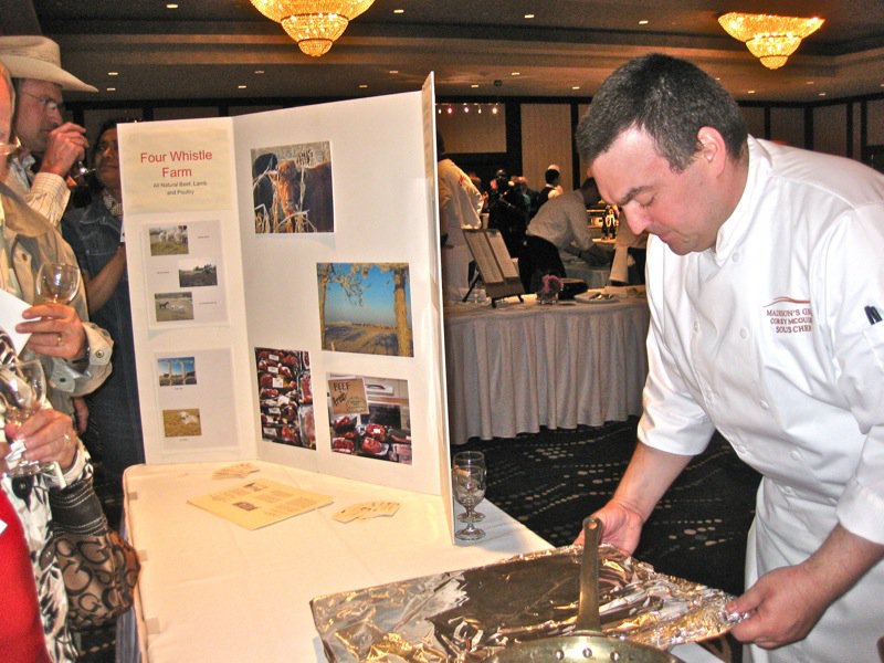 Cathy, Wendy, and I headed for the first booth that was the most accessible: right in the middle of the room we found ourselves in front of Blair Lebsack of Madison’s Grill presenting Four Whistle Farm lamb meatballs and pulled lamb shank in the sauce with a white balsamic mint glaze, asparagus, and sweet pea couscous. The wine pairing was a Joie Farm 2008 Riesling. I didn’t go near the wines. I would have loved to had the evening been 4-5 hours. But, within the two hour time frame, if i was going to enjoy a tasting of wine with my bites, I would never make it to each tasting. That would be a lovely evening, but my objective was to make it to each one. Wendy and Cathy got to know each other well, as they did do the wines and we lost each other on and off all evening!