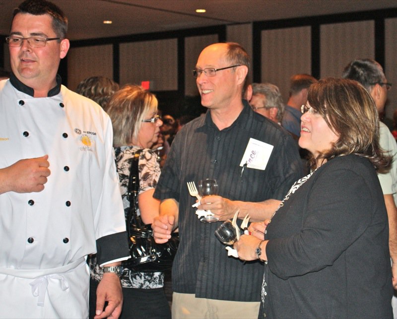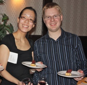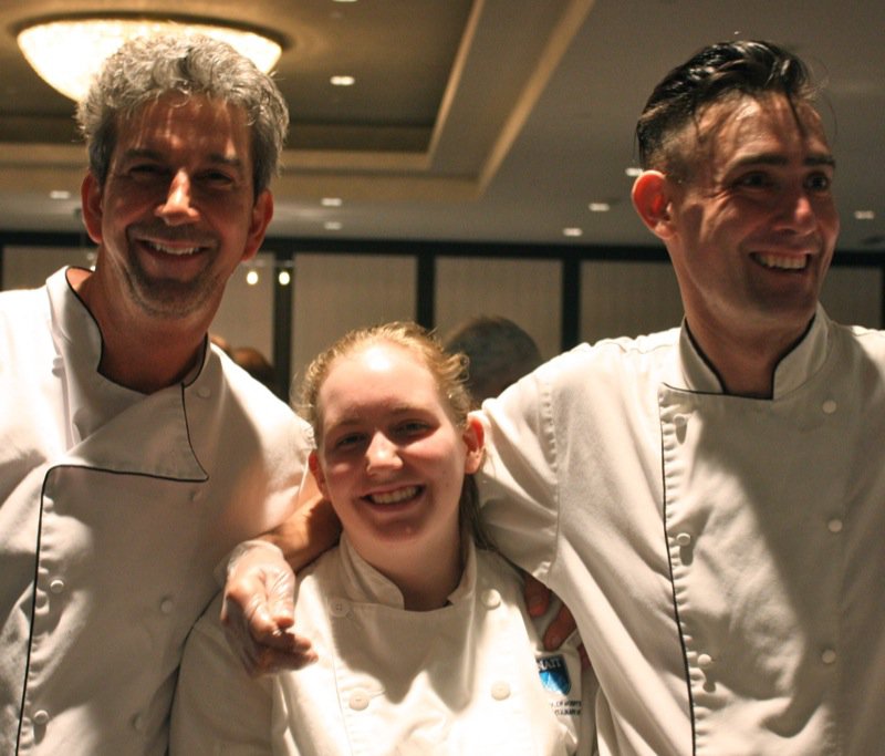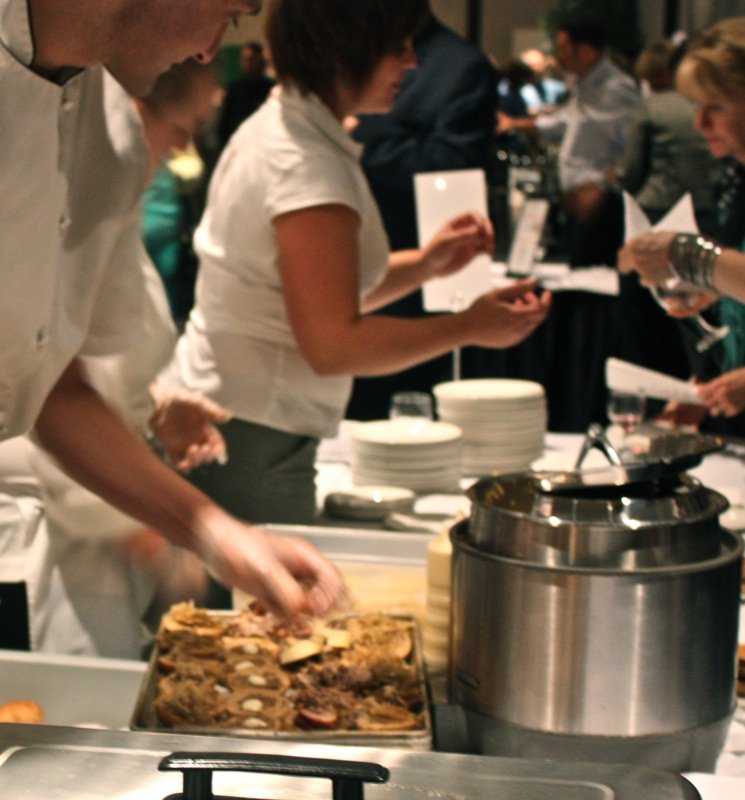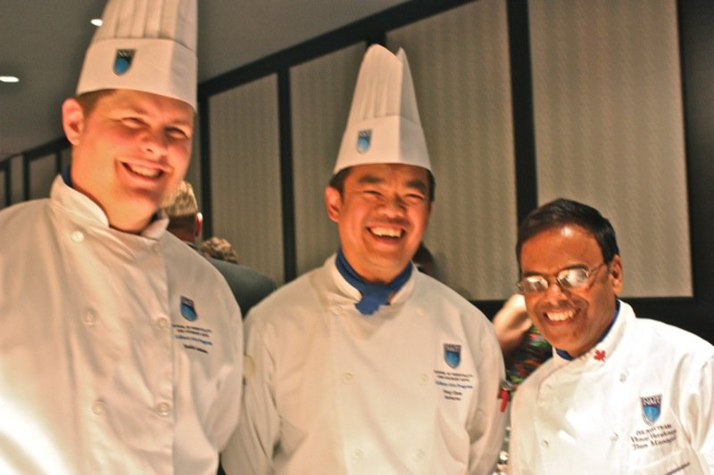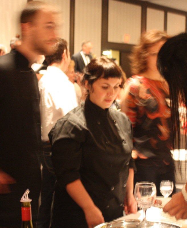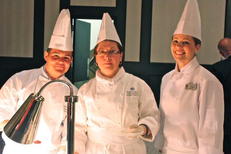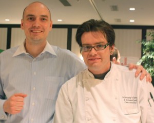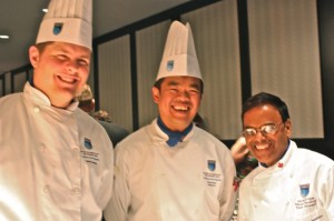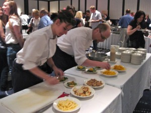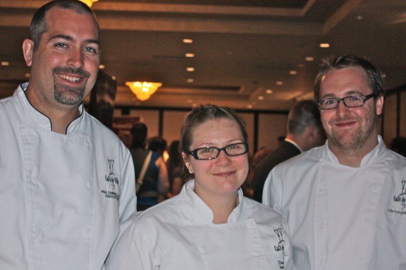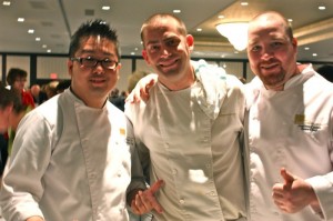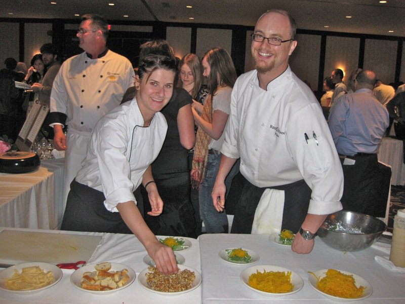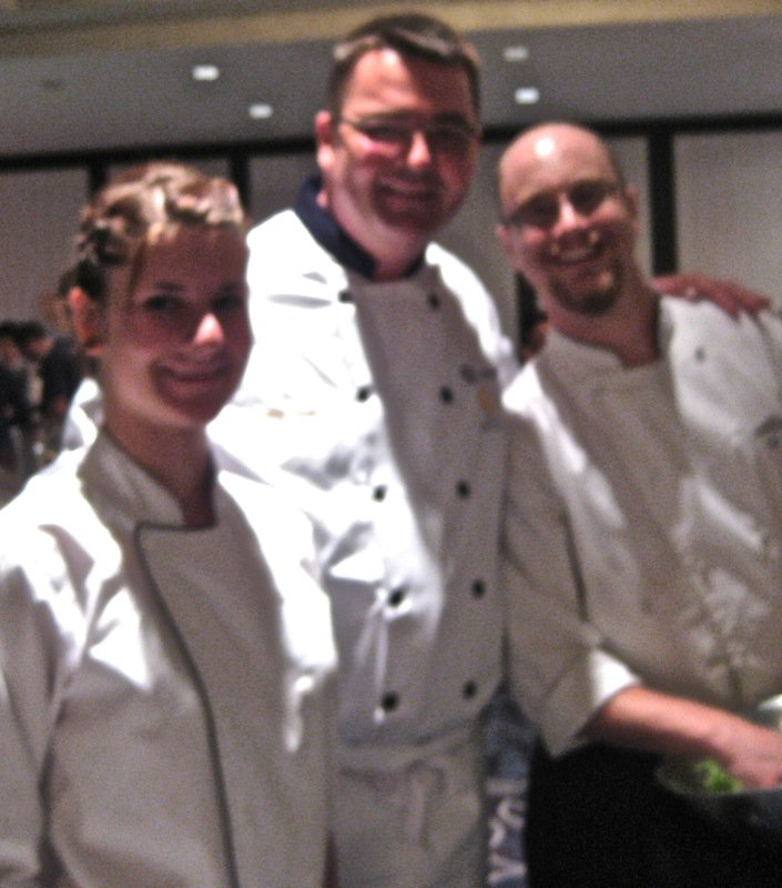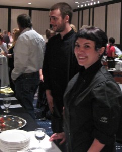 Hello, Chef Hong! NAIT again.This time NAIT School of Hospitality and Culinary Arts. I have visited with Chef Hong trying to get NAIT students involved in Slow Food. This is a start, but we need to do more. They were paired with Sunworks Farm and created a Sunworks chicken roulade with wild mushrooms, pistachios, and apricots on a fresh corn waffle with cranberry and apple relish. The reslish was really delicious. The waffle was definitely fresh once. Not now. It was cold and floppy. The meat was dry. I buy Sunworks chicken often and I think you would have to work to have it this dry. My goodness! Such beautiful produce overcooked. Ah, well. I was really happy to see the fellows out and enjoying themselves as they seemed to be. Keeping the food hot, or creating a dish meant to be served at room temperature might be a better bet for next year… Grat plating idea, though! The wine pairing was Mt. Boucherie Estate Collection 2008 Pinot Gris.