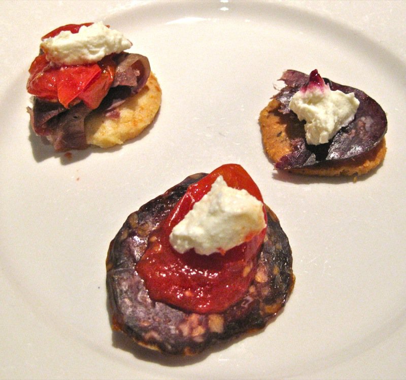 Now on to 4th and Vine Wine Bar and Bistro . They were paired with O Sol’ Meatos. They made the little cracker each tasting was resting on: it was a Pecorino Walnut cracker and do I want the recipe. We all stopped and looked at one another at that bite. The crackers were absolutely perfect. They were substantial enough to hold the meat and toppings, yet light and airy and crisp and flaky and, oh, so flavourful..