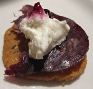 I was so thrilled when Mary Ellen and Andreas’s dish was another of our top tastings (we had four and this is the fourth – not in order of likes, but in this post). I know I love their products and buy them all of the time, but it was exceptionally gratifying to bite into the soft, piping hot fritatta and actually utter a gutteral “YUM!” without thinking about it. Moriarty’s Wine Bar was paired with Greens Eggs & Ham and did they ever do their products justice, using many of them in this multi-layered bite. A Greens Eggs and Ham duck and chorizo flatbread truffle (and I think the truffle is a play on words) spread with a heritage greens pesto and then topped with a duck egg frittata that included chorizo, caramelized onion, and smoked gouda garnished with paprika crème fraiche and a beet chip. WOW. Gorgeous, and delicious. Really delicious. And did I say piping hot?