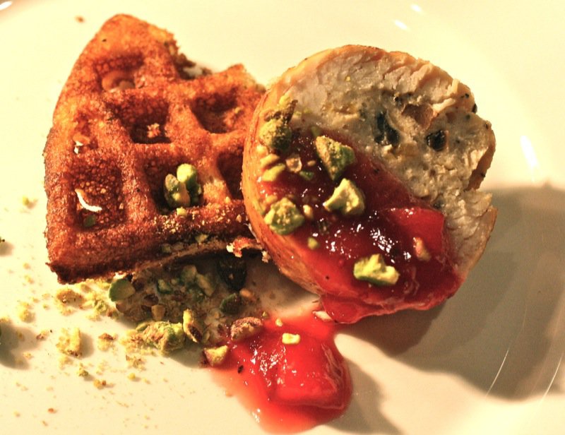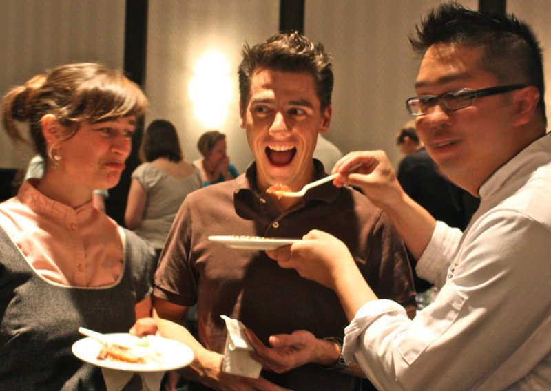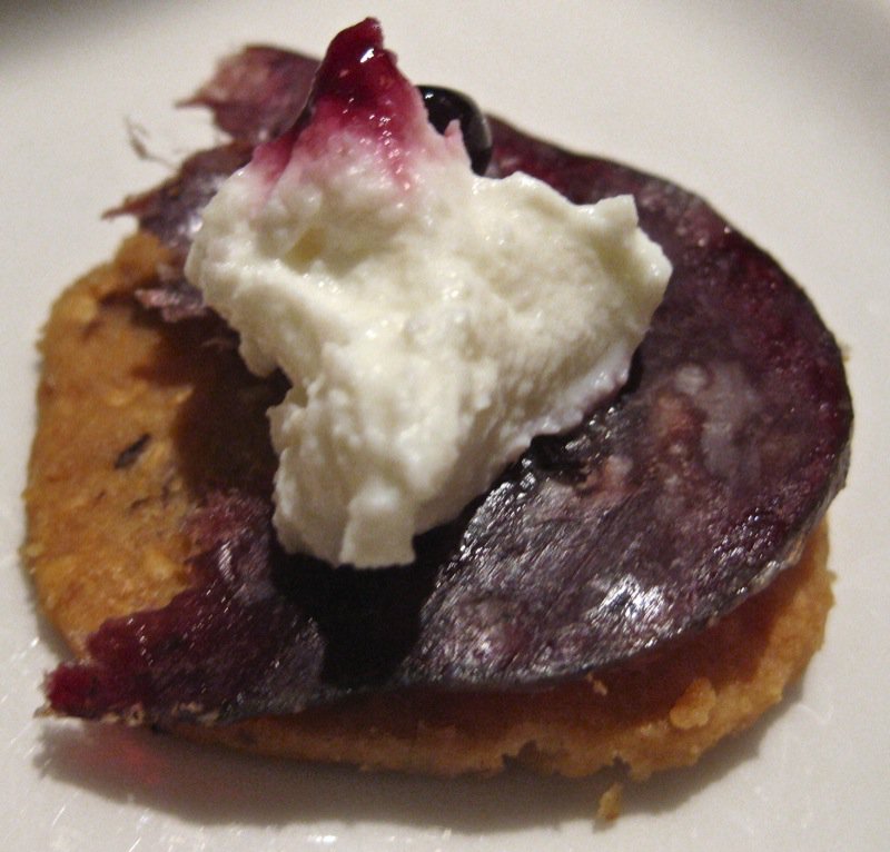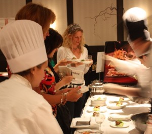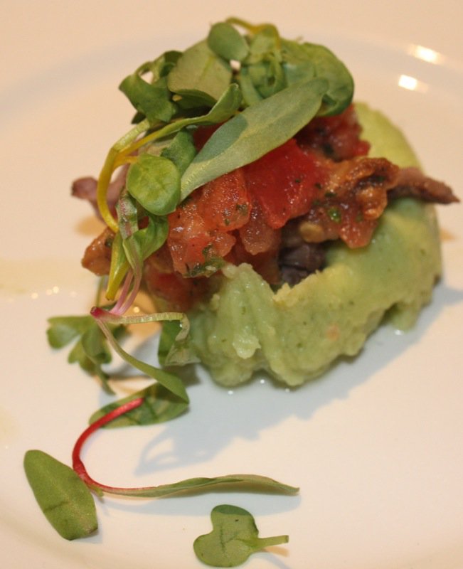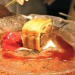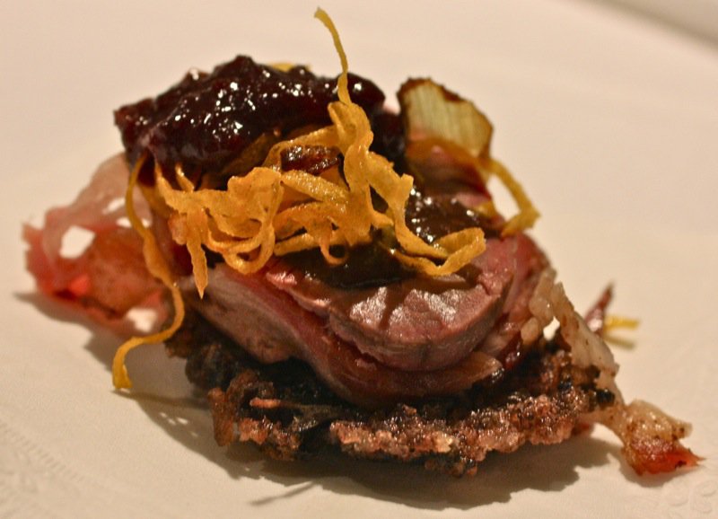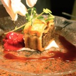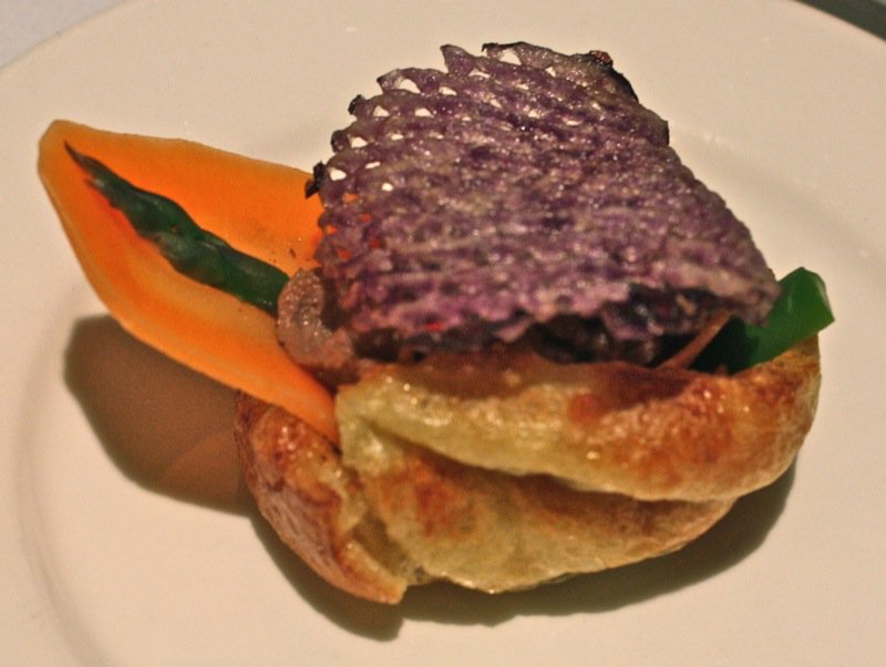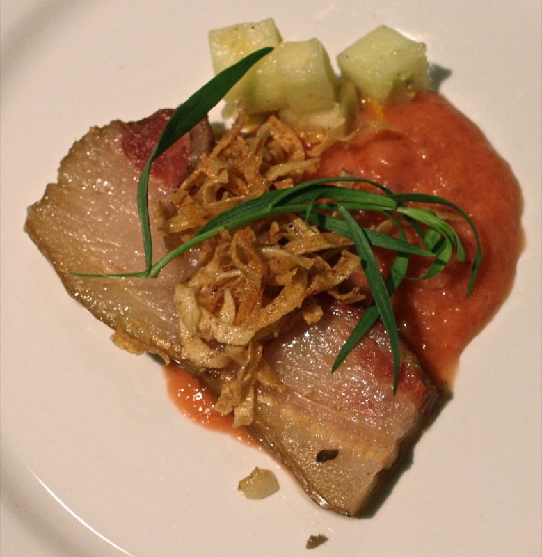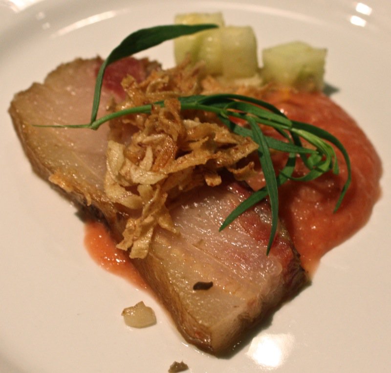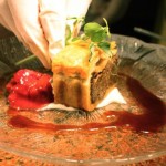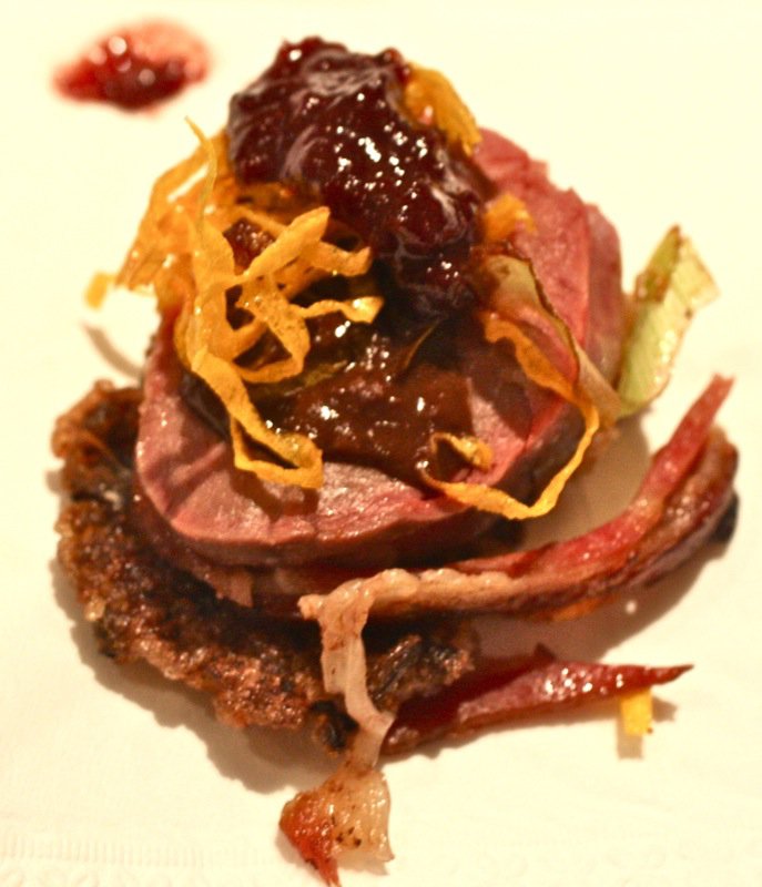 Chef Tony Le and LUX steakhouse+bar wowed us all with another one of the top tasting dishes of the evening (we had four of these). This was Irving’s Farm Fresh second restaurant working with their amaxinf Berkshire boar. And what did they rustle up? Braised Irving’s Farm Fresh Pork Belly accompanied by a tart and crisp confit of Granny Smith apple with Peach and Sour Cherry Jam that breathed a whole new life into the already succulent and deeply delicious (on a primal level… grrr… step away from my food….)Â garnished with taro root frites and tarragon. The tarragon also added that scent of licorice that was incredibly special, and then it was gone. Brilliant dish. If I was not in public, I would have been licking my plate. The wine pairing was the Ex Nihilo 2008 Riesling which was encouraged as a taste pairing enthusiastically by the chefs serving the food.