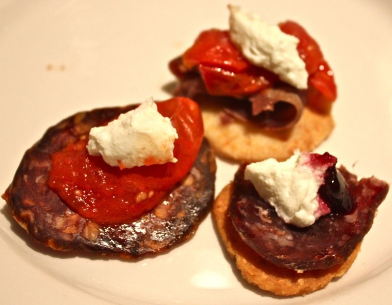 I love artisan meats. Vanja’s family has been making them since the beginning of time, and he has introduced me to such a variety of charcuterie that I have become a little bit of a connoisseur, if I do say so myself. The selection offered from Sol’ Meatos air-dried charcuterie was really lovely. Two were a dry cure and the soft sheep’s cheese with the house-made walnut pecorino crackers topped with cherry tomato and shallot confit was a great bite. But, the meat would most likely be best on its own. It is a substantial flavour and a toothy bit of a bite requiring some serious savouring and chewing. All to be expected for a dry cure, and all worth it. The cracker and toppings were long gone while the meat was still being enjoyed. Black Hills 2008 Nota Bene was the wine pairing here.