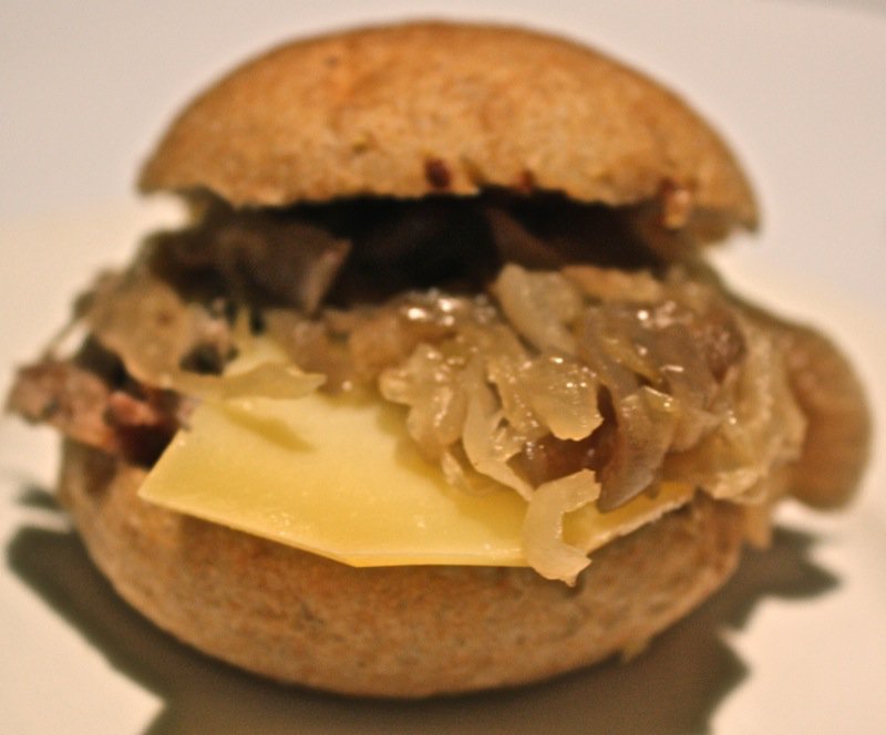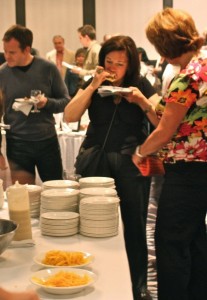 Greetings to NAIT students from The Manor Casual Bistro. I was so pleased to see them participate in this event as that is what Slow Food is all about. I hope the students learned aboutt he organization from their teachers, too, as well as the importance of buying locally and using fresh local produce in their food. They were paired with some very friendly farmers from Natures Green Acres. The cranberry and honey mustard-rubbed braised Nature’s Green Acres nouveau beef brisket was topped with Sylvan Star Gouda and garnished with sauerkraut and caramelized onions on an organic spelt sourdough slider. Really good. The wine pairing was Desert Hills 2007 Merlot.