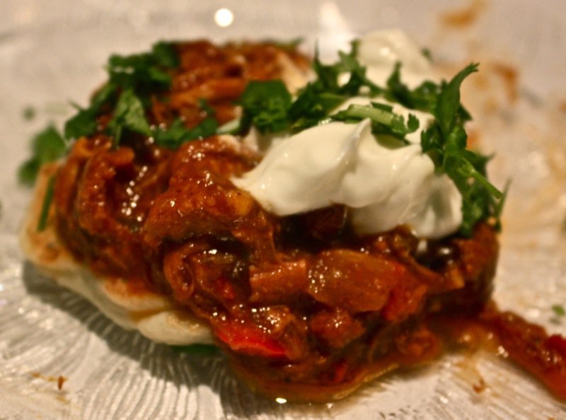 Tzin Wine and Tapas Ltd created an outrageously flavourful bite of Irvings Farm Fresh pulled Berkshire pork chili on a blueberry buttermilk miniature pancake topped with salt-roasted shallot and smoked cheddar cream. Talk about scrumptious. The Berkshire boar has the fat marbled so well through it that it is my pick for pork, always. Their products can be found at both the downtown and Old Strathcona market every Saturday. The pancake was too flimsy to hold the substantial serving atop it, and there was far more topping than pancake; however, when I ate the pancake with some of the pulled pork, the combination was incredible. My thought: make the pancake bigger, and wrap me up some filling! YUM! I heard many comment that this dish was their favourite.