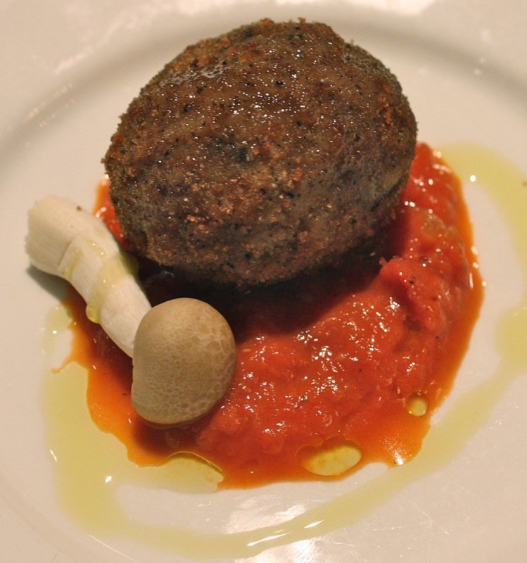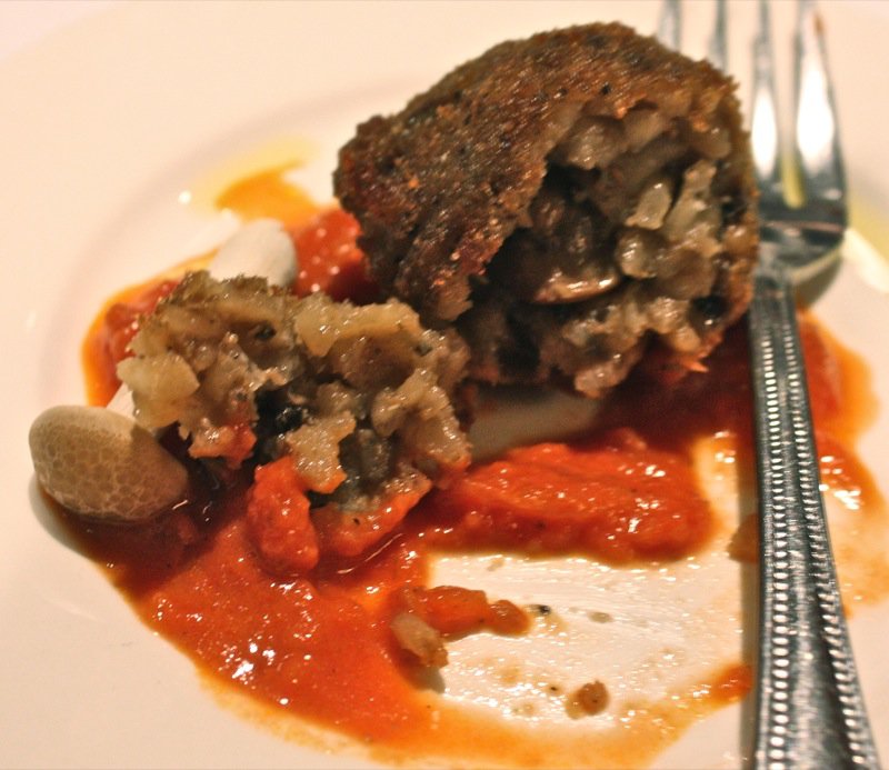 Lit Italian Wine Bar followed with a deep fried risotto ball that had Mona Foods wild arancini mushroom in it with house-made rustic tomato cream sauce and white truffle oil. I do not know about Lit Wine Bar. I was really happy to see them participating in this event. But, I did not taste any white truffle oil. The mushrooms were difficult to detect, and the morsel was barely palatable. Now, this is not a competition at all. It is a celebration of fresh local food and an opportunity for our chefs and restaurants to meet and work with our local suppliers and farmers. So, that was definitely a success. However, Lit is going to have to get some seasoned palates in their kitchen for some good feedback, or they will be in trouble. This dish was a great idea. It looked wonderful. Mona Foods has excellent products. There needed to be a few more steps in the development of this bite.