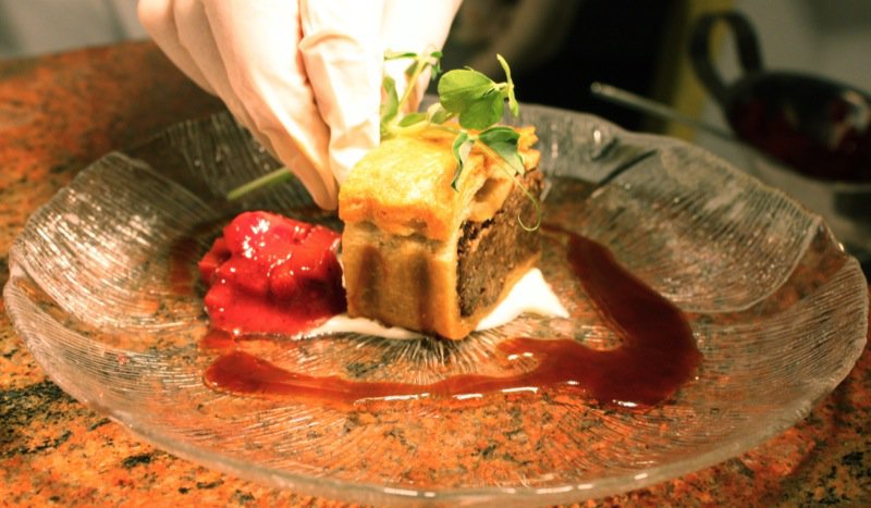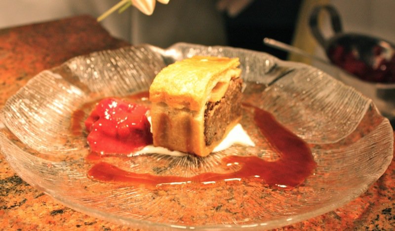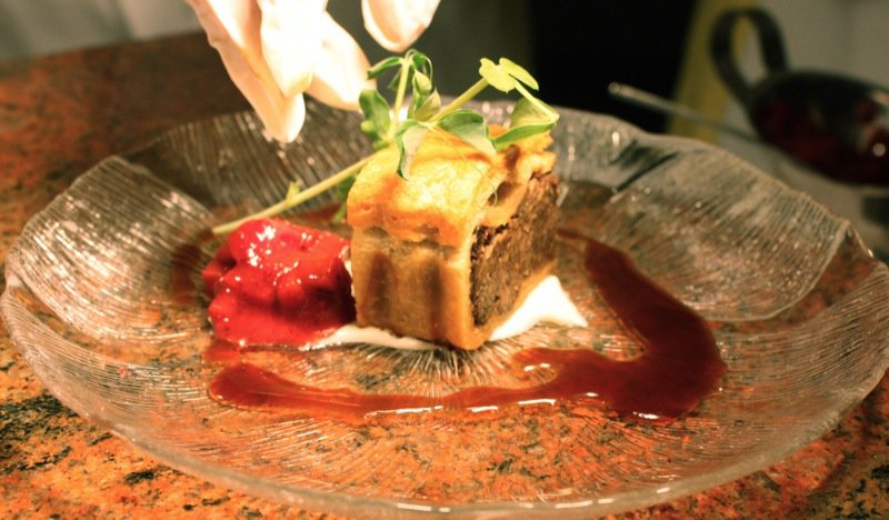 The Shaw Conference Centre was paired with Hog Wild Boar and created a really unique and delicious Hog Wild wild boar tourtiere on a confit rhubarb salad with asparagus and Sauce Soubise (aka white sauce) with wild boar jus. Sound complex? It was. The filling needed tasting and testing and was always nummy… but, complex and earthy and definitely wild. I liked it, but my friends were “widl” about it. The wine pairing was Gray Monk 2007 Odyssey Merlot.