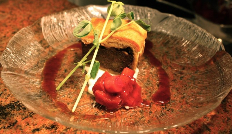 The staff at the Red Ox Inn absolutely surprised us with their salad. It was one of our top tastings of the evening. They were paired with Sylvan Star Cheese and created a bright and lively salad of arugula, Sylvan Star Gouda, candied walnuts with a perfectly acidic and savoury pear vinaigrette. The golden beets were an unexpected contrast. The flavour combination was powerful and really delicious; the eye did not expect the golden tendrils topping the arugula to be the deeply earthy beet. This was accompanied by a Gouda-walnut biscotti which was so well worth thanking the chef for, and I did! The entire dish was “lick the plate clean” good. The wine pairing was Church & State 2009 Pinot Gris.