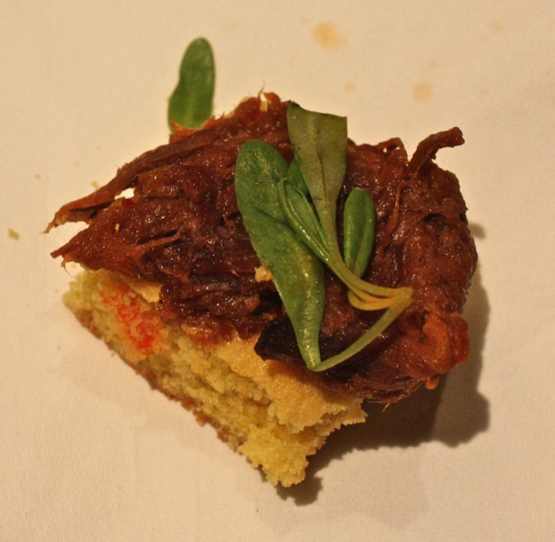Culina‘s bison brisket was slow-cooked in a balsamic barbecue sauce served on a biscuit with horseradish-spiced marinated onion pickles. This was one of our top four tastes of the evening. Talk about a WOW factor. The onions were really delicious: not sweet, not strong, just perfectly tangy. The bison was earthy, but not gamy. It was deeply flavourful and the flaky buttery biscuit was the perfect partner for it. YUM!