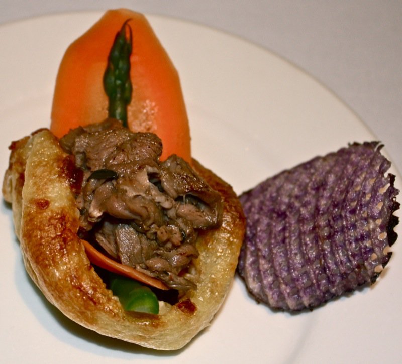 There were many many many beautifully plated dishes this evening, but this one gets my vote for the best. It was not the tastiest. Not in our top four, but look at the beauty here. And, the idea was so thoughtful. Cafe de Ville created a spiced-crust roasted Belle Valley Farm Alpaca with Yorkshire pudding soufflé and Shiraz pan jus that was paired with Mission Hill 2006 Shiraz Reserve.