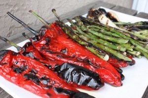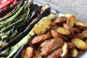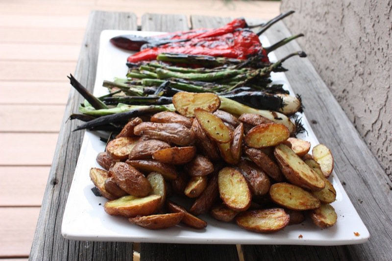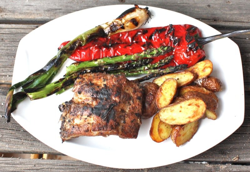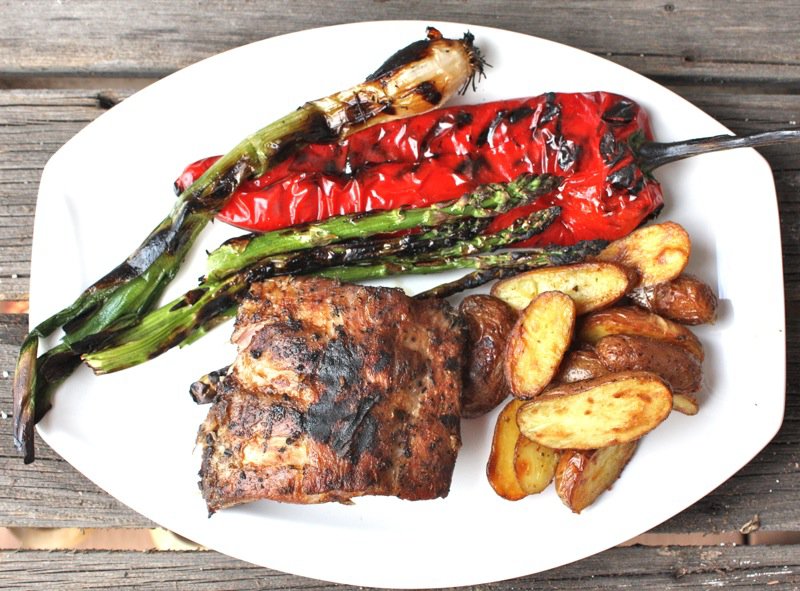 Before I seared the ribs, I roasted the gorgeous sweet peppers, and the asparagus from Edgar’s Farms, and the onions from Kuhlman’s. I was also roasting Greens Eggs & Hams red potatoes in the oven (450ºF with olive oil and garlic, turned at 10 minutes, and roasted for 20 minutes). This was truly the first nice weekend day we have had all season. I think there was one two or three months ago, but I wasn’t ready for it then. I have been very eager to grill during a weekend!