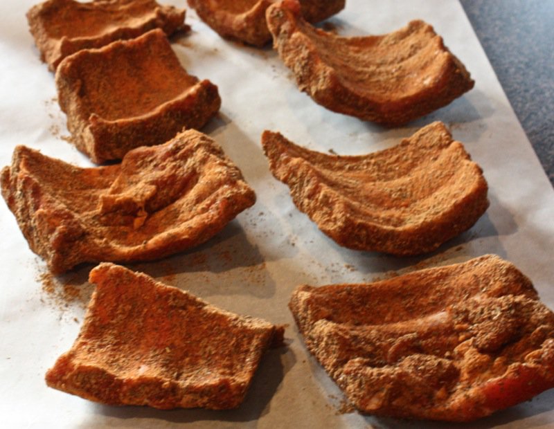 - Generously season each rib with rub; place each on parchment covered pan until all pieces are covered