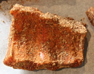 With the ribs well rinsed and patted dry, I pushed each into the rub, and it coated the ribs beautifully. I was impressed.