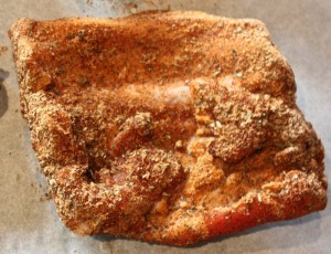I started with 3 tablespoons of fresh paprika. I bring it back with me from a little independent spice store in Belgrade every year. They pack it in a paper bag for me, and by the time I am home, the bag is translucent with the oils from the freshness of this lovely sweet paprika. I have found none other as good anywhere. I then added 3 tablespoons of ancho chile powder made by grinding dried ancho chiles in my Thermomix. I love the deep flavour of this dried chile. Garlic powder (as fresh garlic develops an off-putting flavour when cooking sous vide, according to Douglas Baldwin), a small portion of cumin seeds, basil leaves, a bit of brown and white sugar, and the addition of salt and pepper rounded out the rub. The recipe follows.