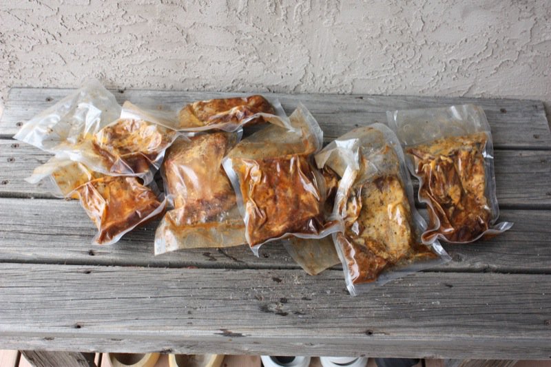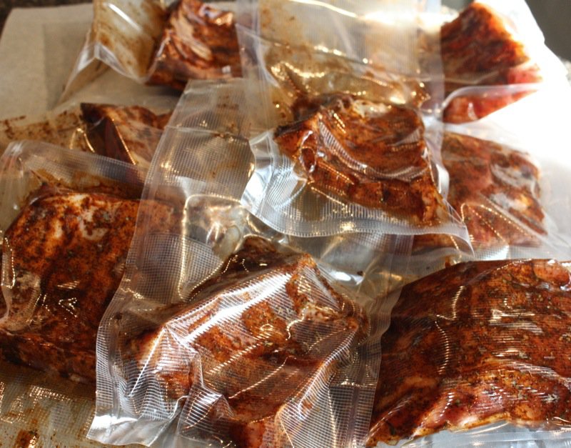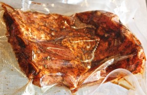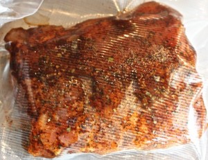 Each was vacuum packed into individual bags. The colour of the rub intensified as the moisture from the meat dissolved it.