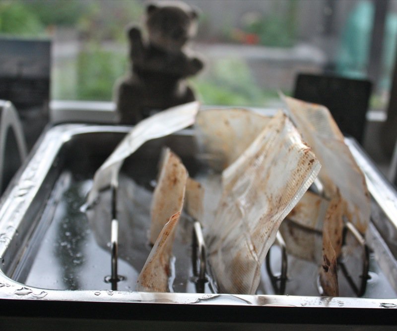 This time I changed the position of the racks. These were put into the water at 155ºF for 24 hours. When the time was up, they were put into an ice bath of 50% ice (at least) to 50%, or less, of water to cool quickly, then placed in the fridge for dinner that evening.