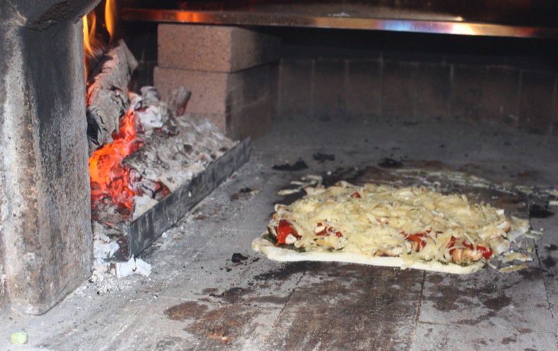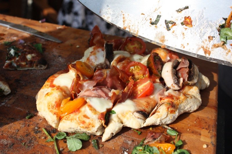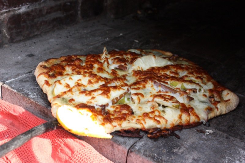 I was just mesmerized. There is something so primal about watching one’s food cooked by an open fire.( Grrr….!) I could have pulled up a chair and watched the process all evening…. and almost did. But, one more pizza to cook!