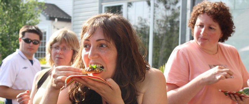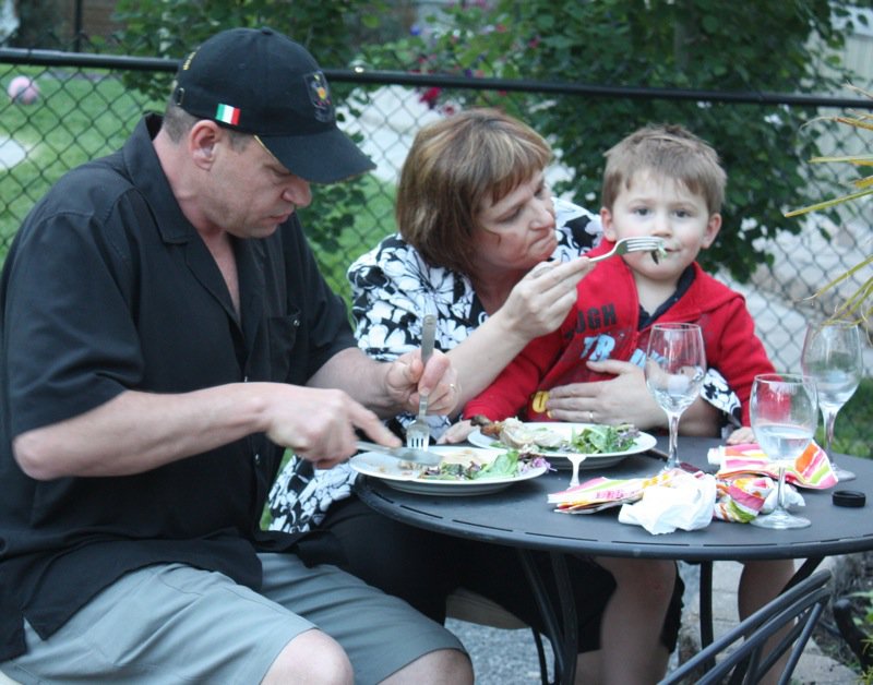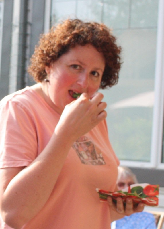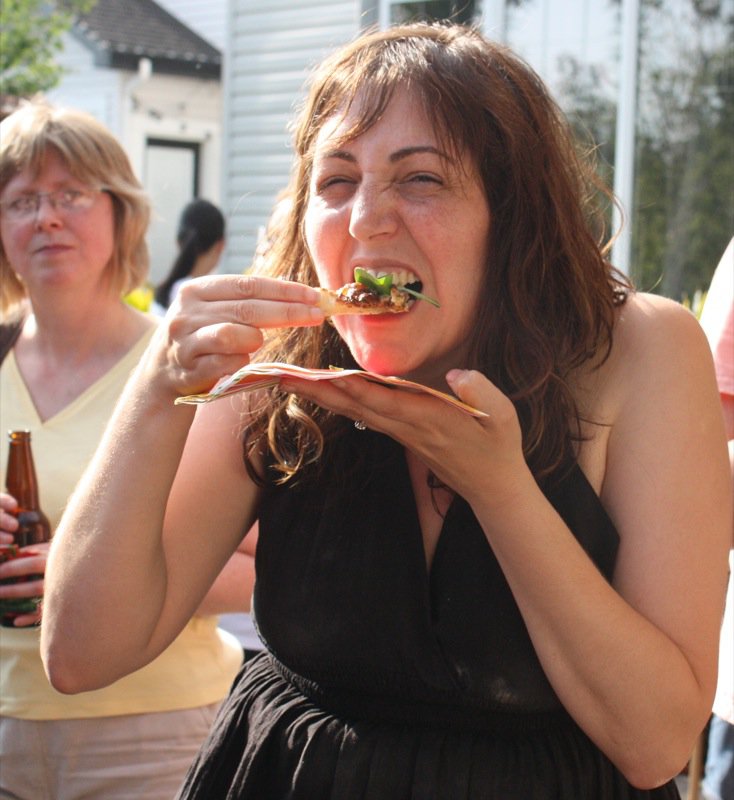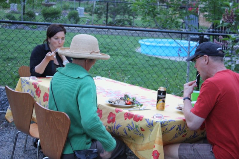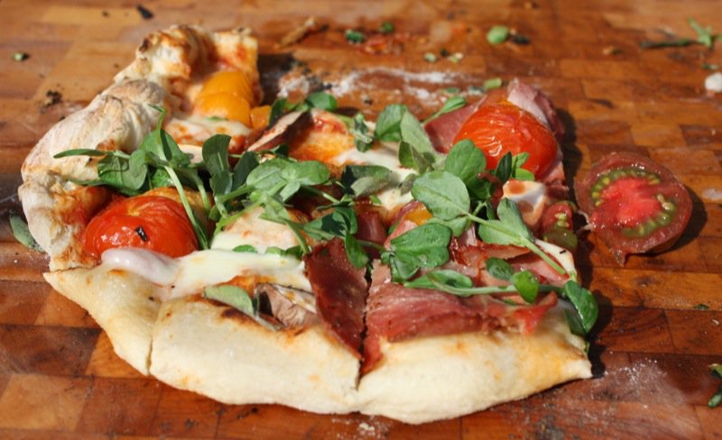 Sharon and Mack worked as a team in the kitchen. Hey, where was my Chef Sous? (I think he was outside tending the beer!) They also brought Bocconcini cheese, tomato sauce, beautiful heirloom tomatoes, and Capicola and Prosciutto. They topped their pizzas, after they came out of the oven with baby pea tendrils (micro-green size) and they looked fantastic. Theirs was Vanja’s favourite. (Humph!) Well, one of mine tied with it.
