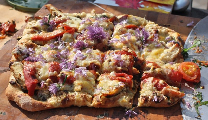 Above, Vince is using his infrared thermometer to check the temperature of the oven. (and a couple of other things!) I think I need a gadget like this. I wonder how precise it is. Below is my Chicken and Roasted Red Pepper pizza garnished with chive flowers. I loved how it looked. This one was Vanja’s other favourite. (Phew!)