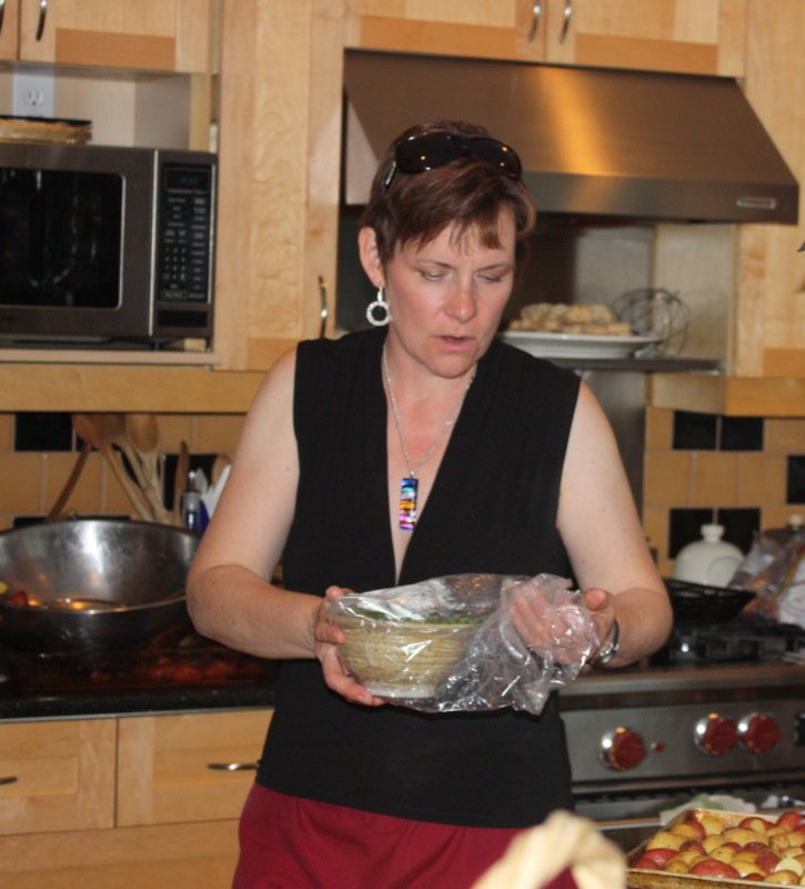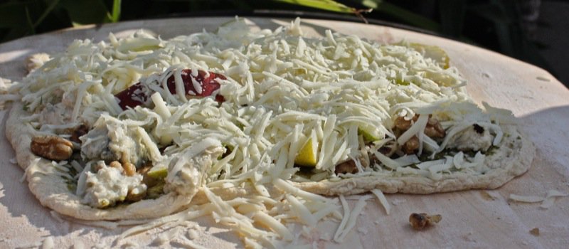 Four people were designated to bring enough toppings for three pizzas each. I was one of those four. I was really happy about that. I make homemade grilled pizzas all of the time and had my pestos and sauces made and frozen in individual portions in the freezer. (Yeah!) Vince and Colleen made all of the dough. What beautiful dough. Colleen, please tell us what kind it is again: give us the name for it, and the recipe in your comments here, please! They not only made dough for 12 pizzas and had that proofing when we arrived, but they made all of the breads that were served at the meal, and the cookies and the panacotta for dessert, too!