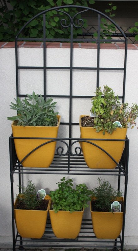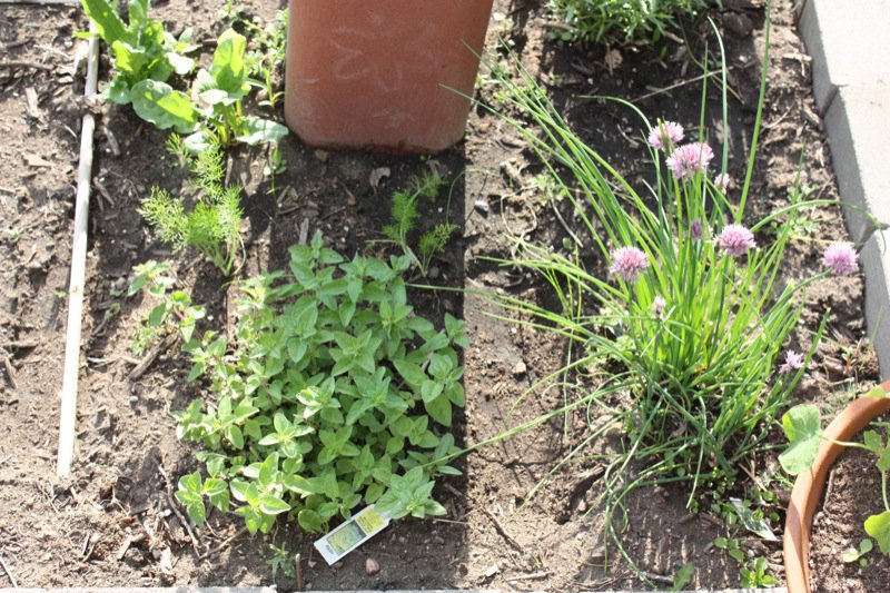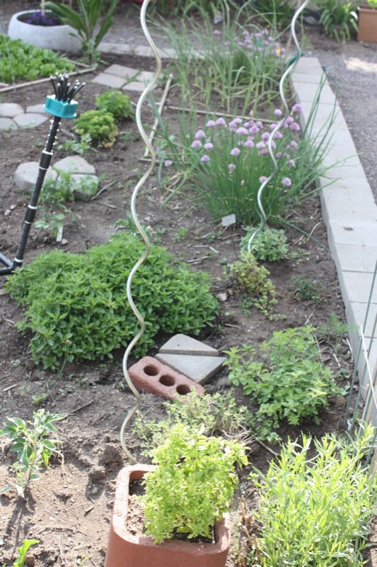 This little plot and paths are hidden behind Sophia and her wall. Vanja noticed the herbs in pots on a trellis near the house, too. Nice.