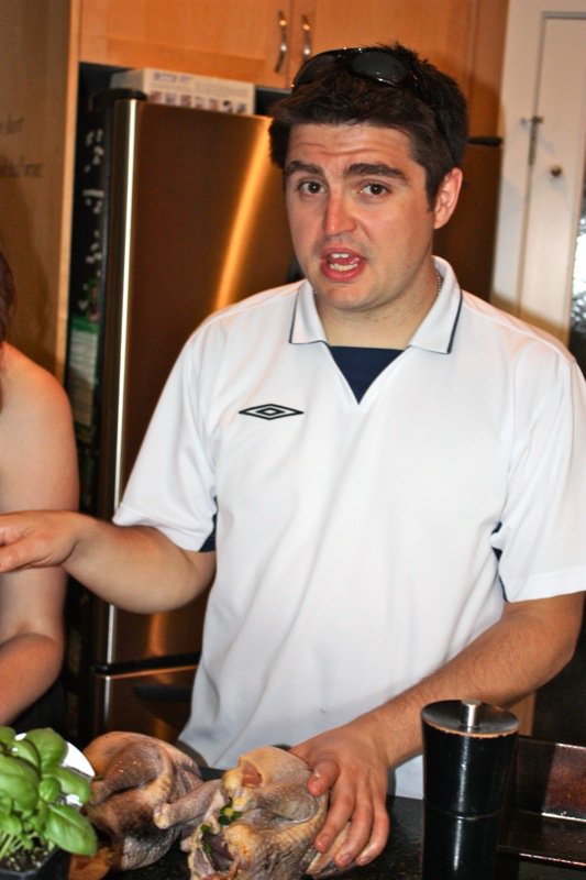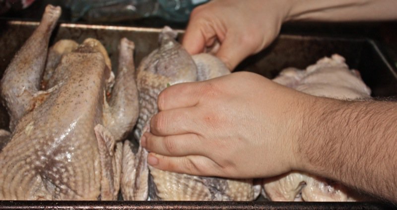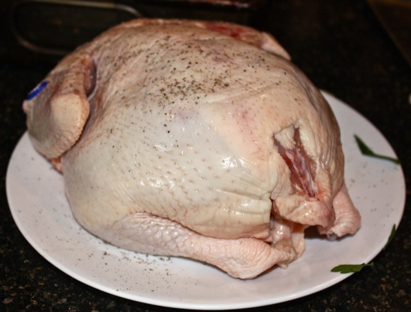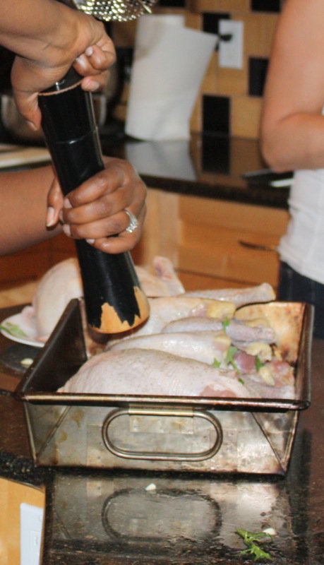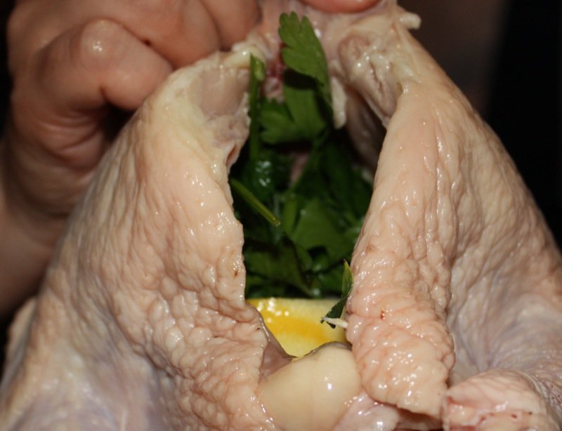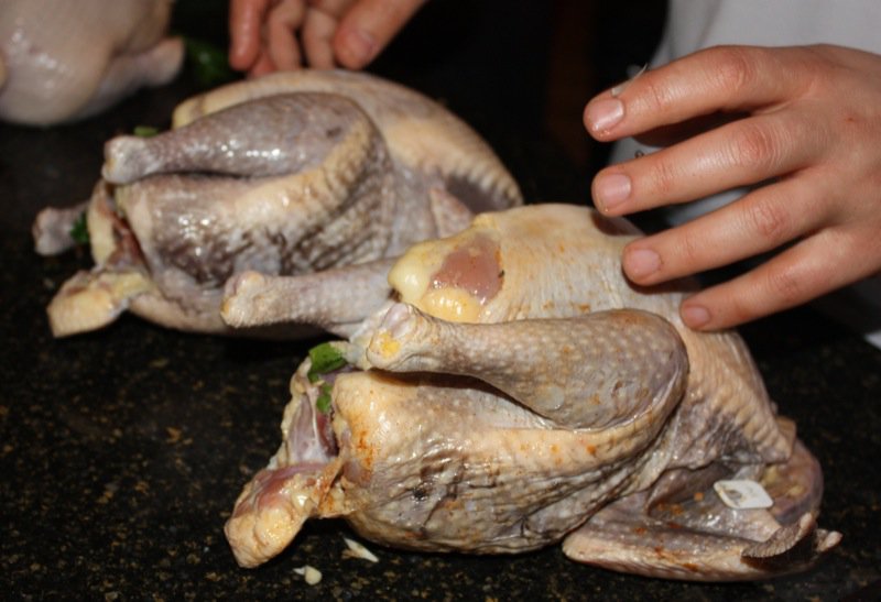 Birds were stuffed with herbs and lemon and seasoned with salt and pepper. Look at how gorgeous they are! The chicken is particularly plump!