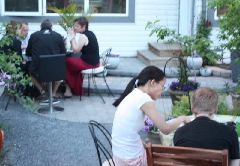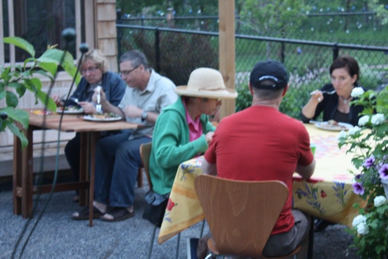 Kitchen cleaned, pizza gone, whole new crew in the kitchen getting instructions for the main course: time to snoop at the lovely garden. I was stunned by how big everything was. But, I no longer have a garden… just little spaces I plant it. I suppose I would have definitely planted by the May 24th weekend, if not before. So, I should not have been so shocked. But, I was. The garden looked beautiful. It was a delight to explore the varieties and see what I didn’t plant in a corner that Colleen and Vince have planted.