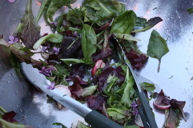 Thank goodness I had my camera. Following up this salad was a beautiful tossed green salad with lilac flower petals. Renata got the greens from Greens Eggs & Ham and I hope she will fill us in on the iilacs. I didn’t even know they were edible until I was at Indulgence Tuesday when Gwen from Inspired Market Gardens served them with Leva‘s Lavendar ice cream as a garnish. What do they taste like? They taste how lilacs smell. Just like lilacs. But, maybe with everything else in the salad, they added a special twist? In any case, they were beautiful.