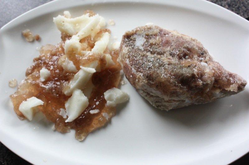 - Remove the pork from the bag and reserve the liquid from the bag (Place the liquid in a container in the fridge overnight, skim the fat off and reserve the jellied stock for future use)