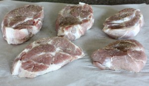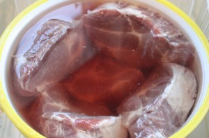 The beautiful pork shoulder roast was cut into five portions that were marinated in a 70% salt and 30 % sugar solution for 12 hours, rinsed well, patted dry, and seasoned with Kosher salt and freshly ground pepper.