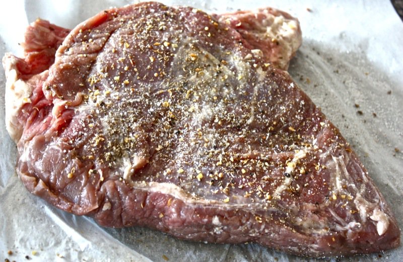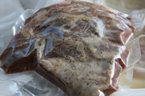 Where to start? At this point, I was still new to the process (not that I am seasoned now, after two weeks of “sous viding”) so I consistently read the recipe. I started with a three hour brining in the fridge. I didn’t cut any slits in the fat cap because my piece was so small. I was careful and studied with my seasoning. I used some of Schwartz’s Montreal Steak Spice that we bought when in Montreal with a little Kosher salt and freshly ground black pepper.