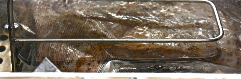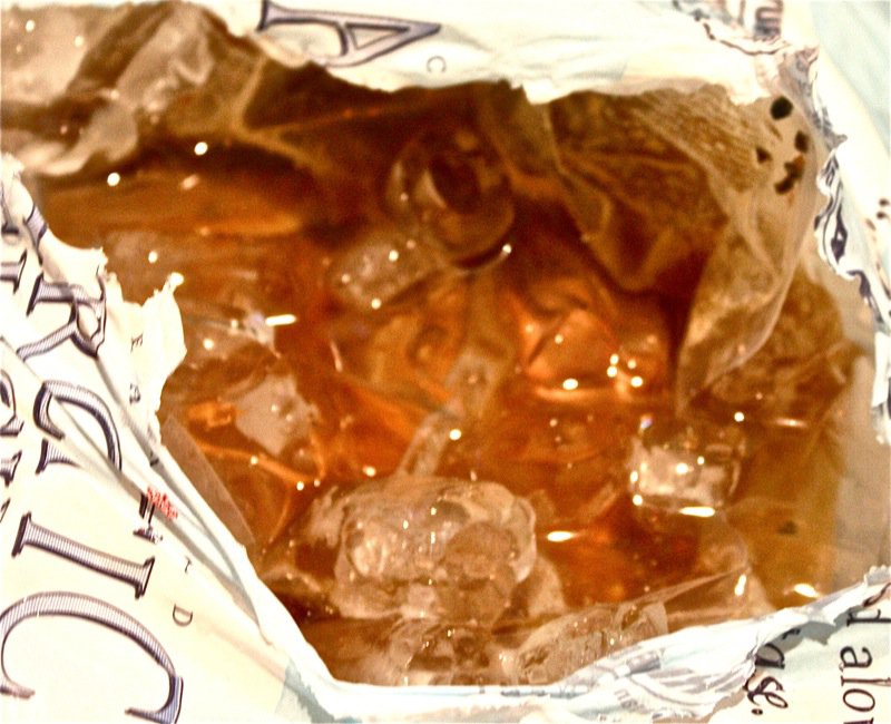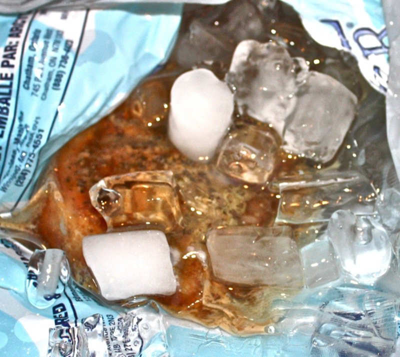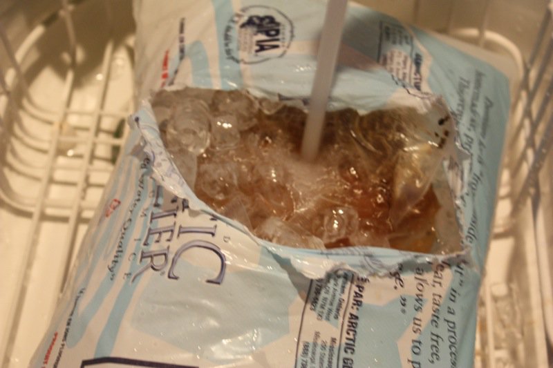 Twenty four hours later I had a bag of ice waiting. When the time was up, I whisked the packaged meat into the icy water. I just used the ice bag to contain the ice as with a small portion to cool, have found that it is easier to control a minimum of 50% ice in the chilled bath.