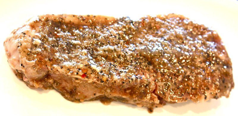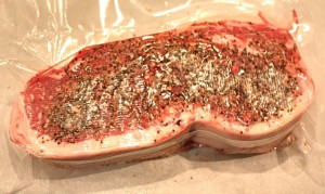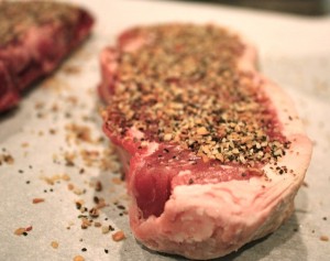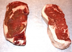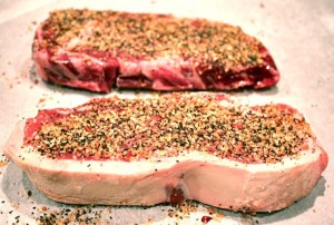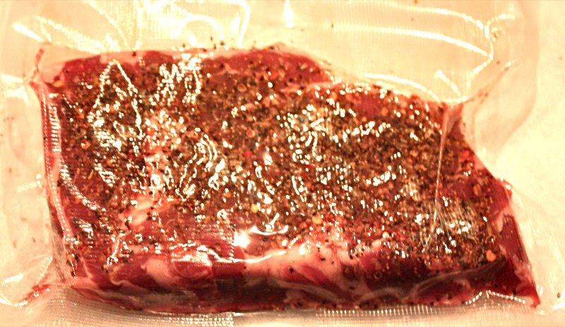 Steaks were seasoned with Schwartz’s Montreal Steak Spice that we bought when in Montreal with a little Kosher salt and freshly ground black pepper then vacuum sealed with my Foodsaver.