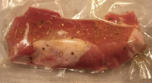 - Rinse, dry with paper towels and season with Kosher salt and coarse ground pepper; vacuum seal pork chops (one per bag)