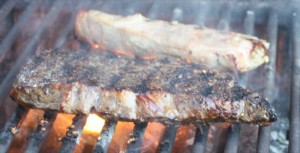 We were all camera happy that day! Look at the flame hitting this beauty. The grill was so hot, that it did not take long to get this sear: a little less than 30 seconds per side.
