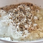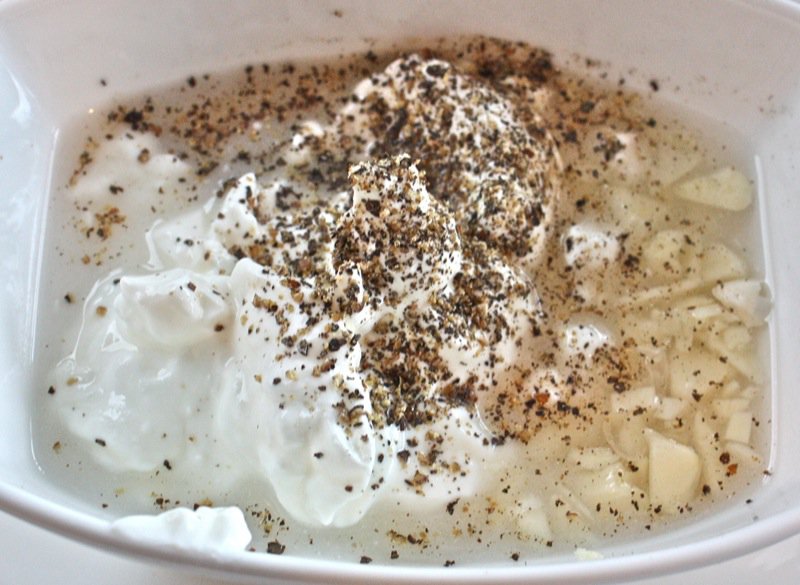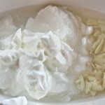 My only addition today: garlic. The creamy sweet and sour vinegar dressing is the perfect foil for the tender and often bitter little green leaves that rear their heads first in the garden. The cream used to come from that skimmed off of the cows milk in the morning. Oh, the new vegetables in the Spring: creamed peas, creamed carrots, creamed peas and carrots. Oh my. And the salad was very lightly dressed with this same cream, the perfect combination of sugar and salt with the tang of white vinegar. This was (and is) such a treat with thinly slivered onions. This salad must have thinly slivered onions in it. You cannot see any in the above pic, but I used red ones.
