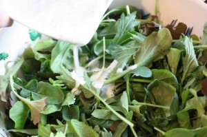 - Combine all ingredients and taste to adjust seasoning and thin so that it just coats the tender leaves