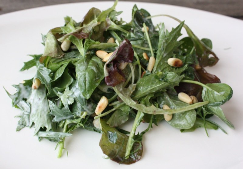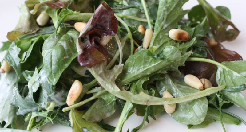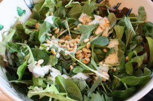 I can’t think of anything better than a salad with a variety of greens and herbs from one’s garden! Yours is wonderful and I approve the addition of garlic and pine nuts lol!