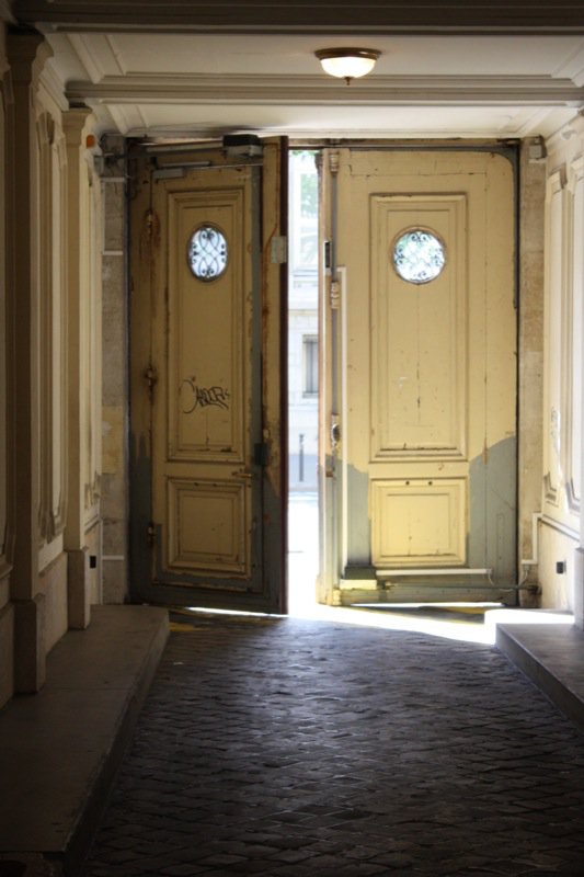 Eventually, we did shove it open (that is it from inside, below) and we found ourselves in an entryway to a parking courtyard. Hmmm?