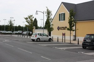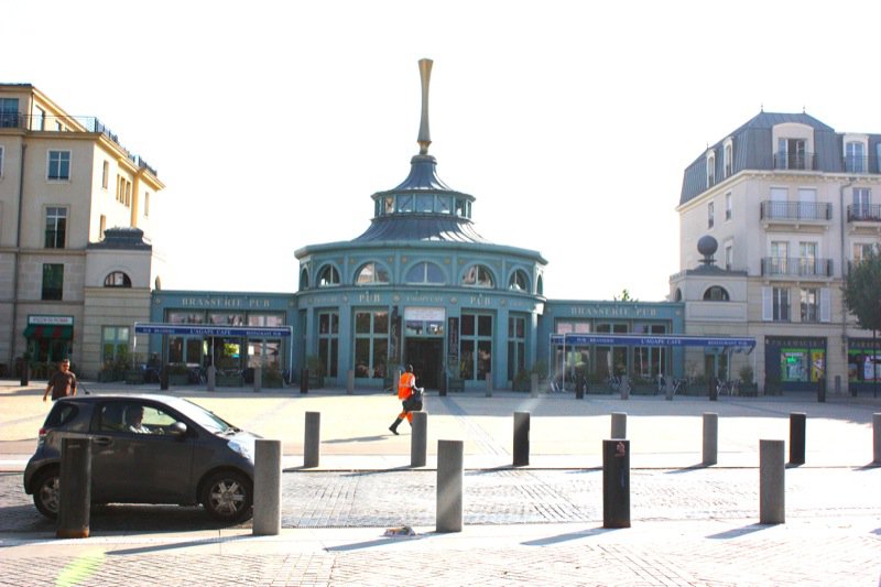 The train ride took about 40 minutes, but seemed like much less as we enjoyed watching the countryside whip by. (It was covered by the 7 day 30 Euro metro and transportation pass we bought at the airport.) Upon disembarking, we stepped out of the station and viewed this extremely new and very modern square. I was expecting a quaint little French village with outlets at one end.