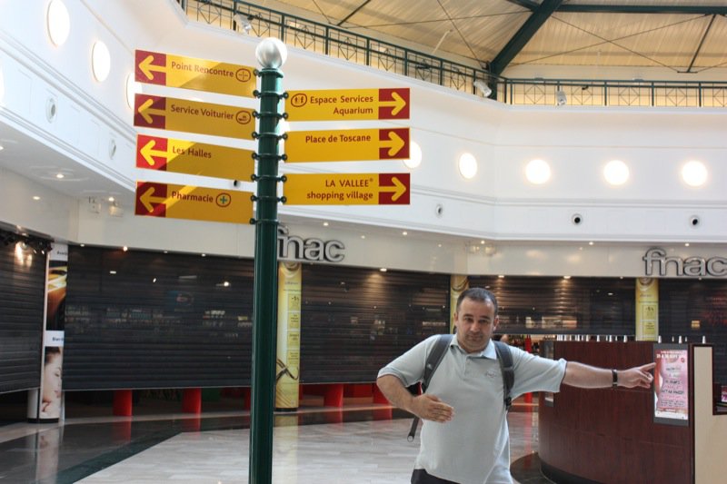 We passed by this hotel, and it became apparent that as this was the stop before Euro Disney on the R&R, that it was probable that this obviously new community was created to host the visitors from there. To the right, as told, we entered into two massive doors and found ourselves in a huge “West Edmonton Mall”. Was this it? Really, we didn’t know, but we smelled coffee down the escalator and had not had ours yet as we left the hotel at 7:15 am. It was only 8 :15 and nothing was clearly open except the cafés. (We arrived much faster than we had expected!)