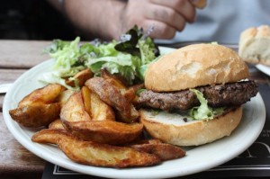 Take a look at our lunch, and you would not even ask. I thought Paul’s would be a good local bet. The cucumber soup was dill pickle soup. A little misunderstanding, but it was really awful. The quiche was actually very nice. So was Vanja’s burger, but it is not very ” French villagey”!