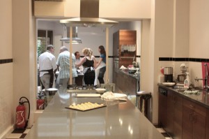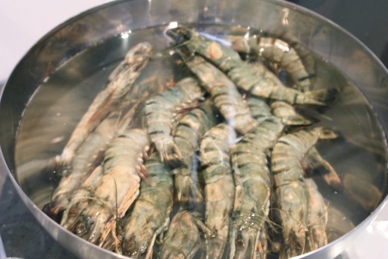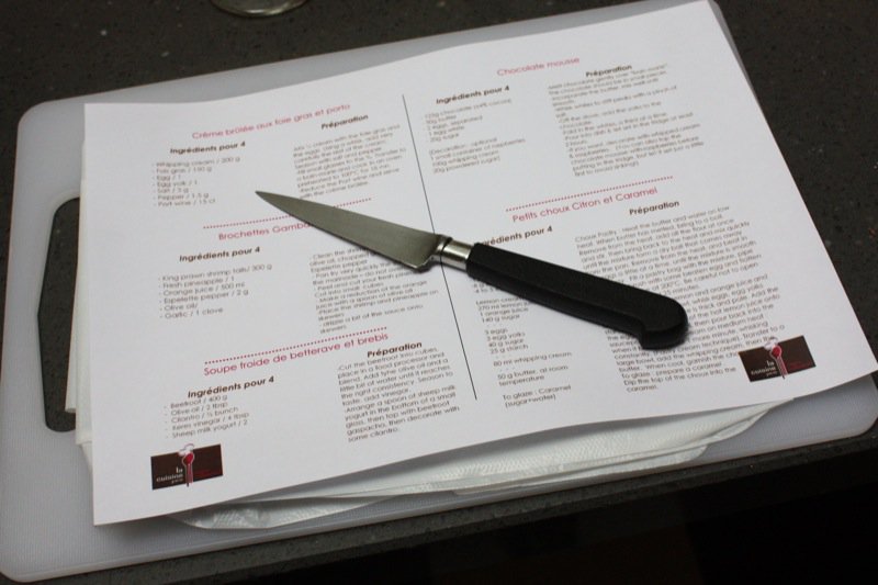 The foie gras verrines each got a splash of port. Oh my goodness. It was really incredible. It wasn’t set, either. After baking in the bain-marie, it was to set in the fridge for a few hours. I would definitely suggest that those selecting the recipes for these classes need to be the Chefs. The recipes were all very tasty, but this one was not set. The citron mousse was not set. The chocolate mousse was not set. There were 2 shrimps per person with 4 extra. That was too slim for me at 90 Euro a person for this experience. At a minimum, there should have been three shimps per person.